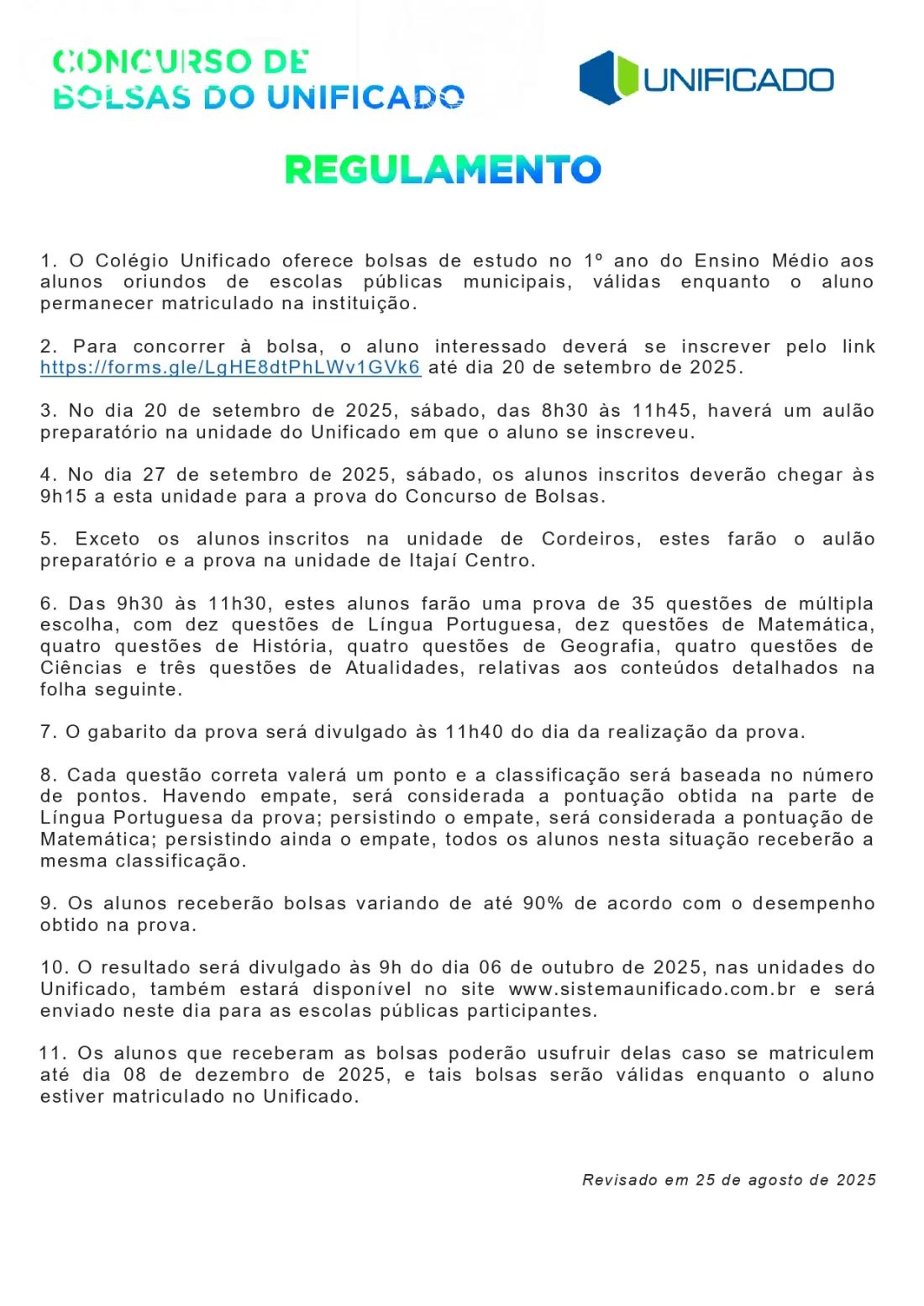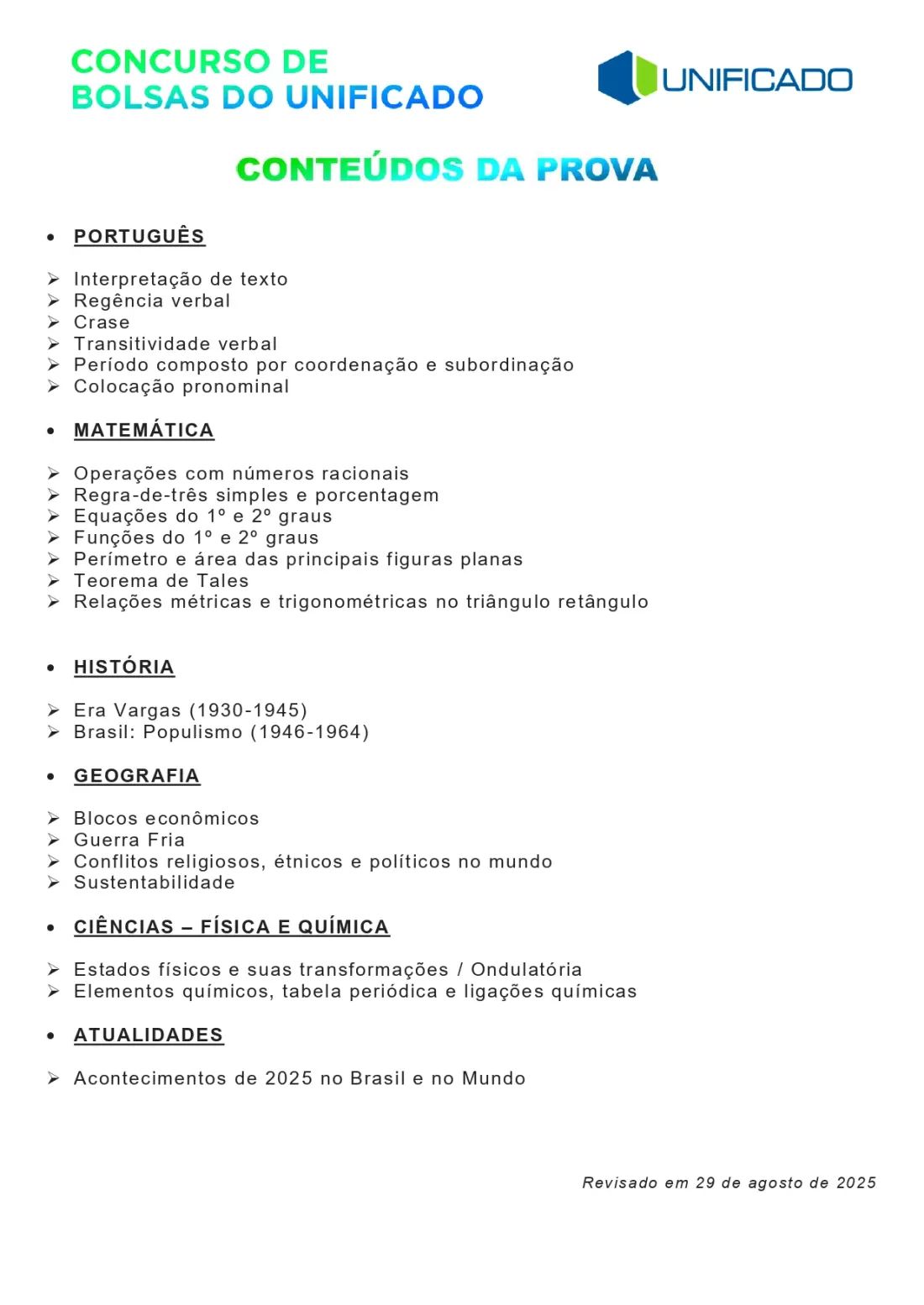 Confira o regulamento e os conteúdos para a prova do Concurso de Bolsas, clicando no link a seguir: REGULAMENTO + CONTEÚDO DAS PROVAS 2025