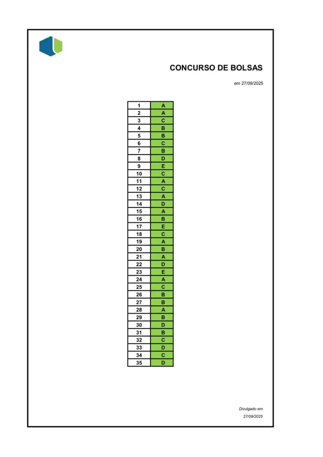 No sábado, dia 27/setembro, realizamos o Concurso de Bolsas do Colégio Unificado, e informamos que os resultados já estão disponíveis para consulta. Para garantir total transparência no processo, anexamos o gabarito da prova do Concurso de Bolsas para que todos os participantes possam conferir seus desempenhos.